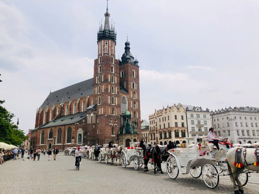 Krakow’s Main Square (Rynek Główny) is one of the largest medieval town squares in Europe, and it earns every inch of its reputation. The first time I walked into the expanse, the scale caught me off guard: the vast cobblestone floor, the twin towers of St. Mary’s Basilica piercing the skyline, and white horse-drawn carriages clip-clopping past the long, elegant arcade of the Cloth Hall. It feels like stepping into a pocket of history that time simply forgot to age.
