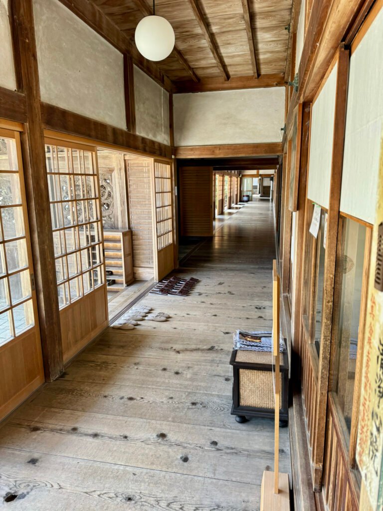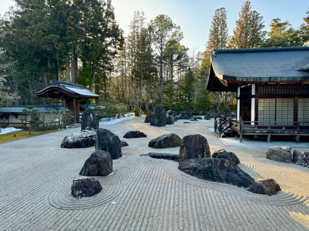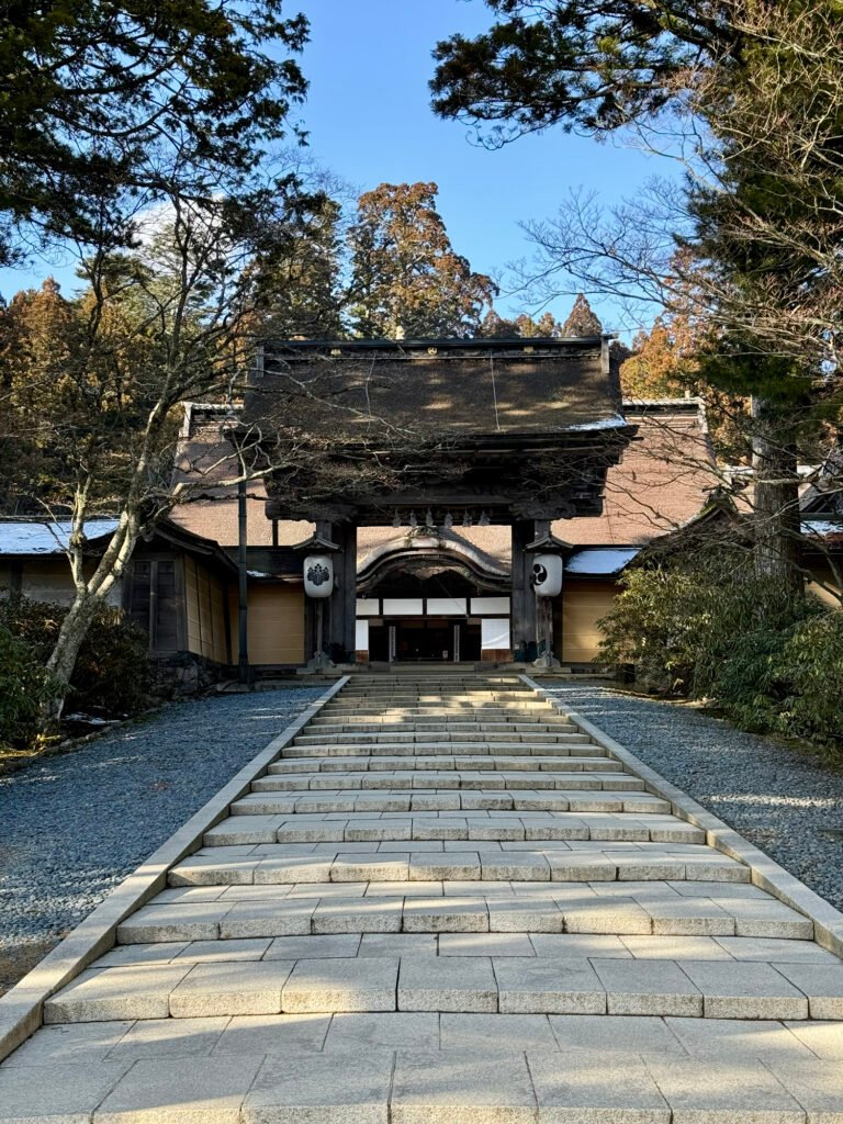 From there, we visited Kongobu-ji (金剛峯寺), the head temple of Shingon Buddhism. It is a sprawling, masterful complex, home to Japan’s largest rock garden and interior rooms lined with stunning painted sliding screens (fusuma-e). Photography is restricted inside, which forces you to actually look. We moved slowly and quietly through the halls, arriving back at our temple stay for dinner feeling already changed by the mountain air.