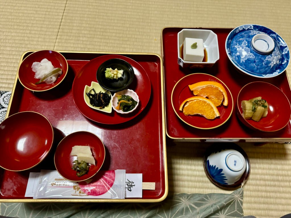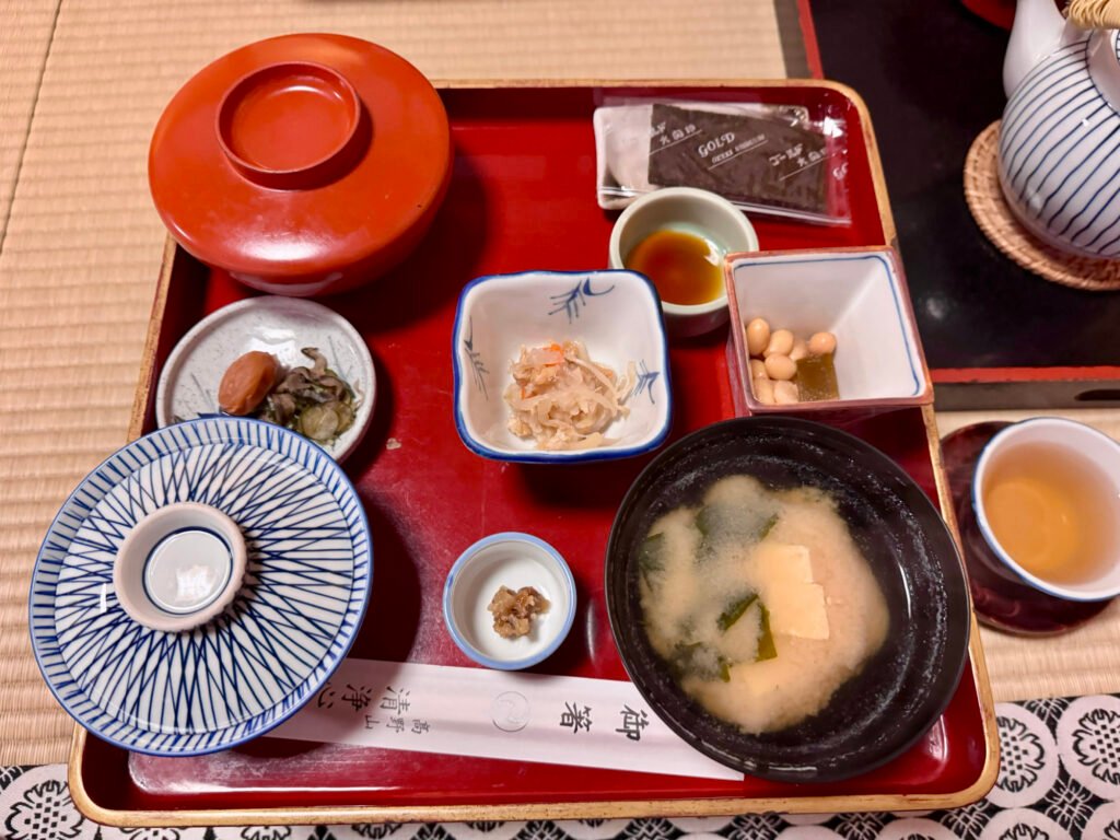 Dinner was served in a large communal hall. All the temple guests sat together on the tatami floor at individual low tables, with intricate lacquered trays arranged before us. Then, the silence set in. It wasn’t an awkward, heavy silence; it was an intentional one, the kind that asks you to pay attention to the steam rising from the soup and the texture of the grain.