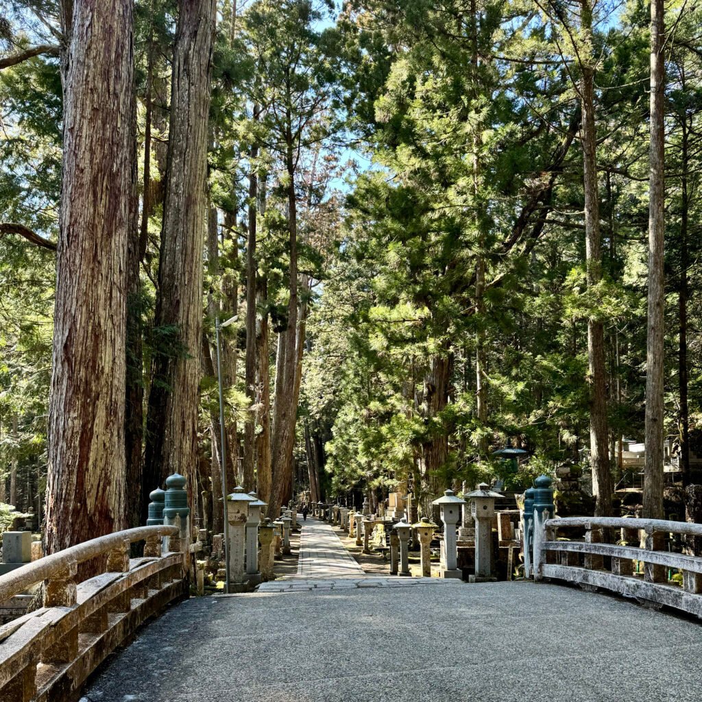 We knew we didn’t have time to walk the full two kilometers to Torodo Hall; in the end, we only made it to the second bridge before turning back. But those twenty minutes were something entirely their own. The giant cedars that had loomed in the lantern-lit dark were now sharp and green against a brilliant blue sky. The grave markers we’d only half-seen the night before revealed names, textures, and centuries of moss.